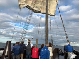 Auch dieses Jahr stach die Kogge „Wissemara“ bei stürmisch-schönem Wetter vollbesetzt in See, und alle Gäste konnten die Ausfahrt gemeinsam in vollen Zügen genießen. Das strahlende Wetter, die frische Meeresbrise und die angenehme Gesellschaft sorgten für eine unvergessliche Atmosphäre an Bord. Es war schön zu sehen, wie sich alle Teilnehmer entspannt zurücklehnten, die Aussicht genossen und die Gemeinschaft spürten. Ein besonderes Highlight war die